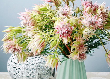 Protea Blushing Bride’s classic yet contemporary appearance makes it an extremely popular bridal flower. Its elegant form and subtle appearance attracts attention without overshadowing the bride. The delicate, papery petals with their pink ‘blush’ give the flowers an appealing vulnerability, but don’t let this delicate appearance fool you: Blushing Bride is a true survivor and known for its long lifespan. Both in a vase and in wedding decorations and
