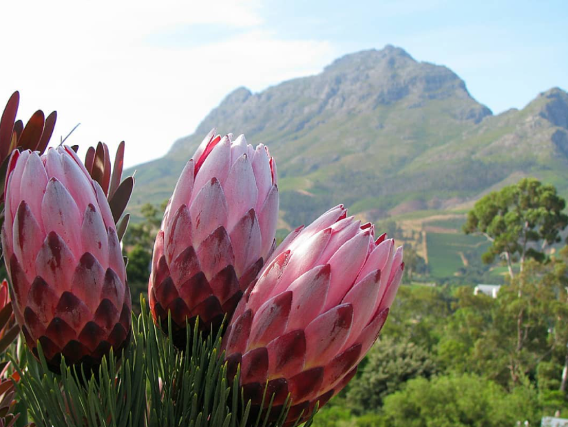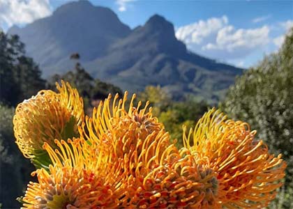 The Protea is a symbol of beauty and diversity, the national flower of South Africa and the centrepiece of the ‘Fynbos’ – the biodiverse vegetation that is unique to the Cape region. Proteas are members of the Proteaceae family. This plant family includes over 1,600 species of which over 300 come under the Protea. This explains the great diversity in shape, size and colour. Proteas have a robust beauty with sturdy flower stems, a mysterious heart (the flower) and often hairy bracts that vary in colour from light to dark pink and coral with white and orangey-yellow around the flower.